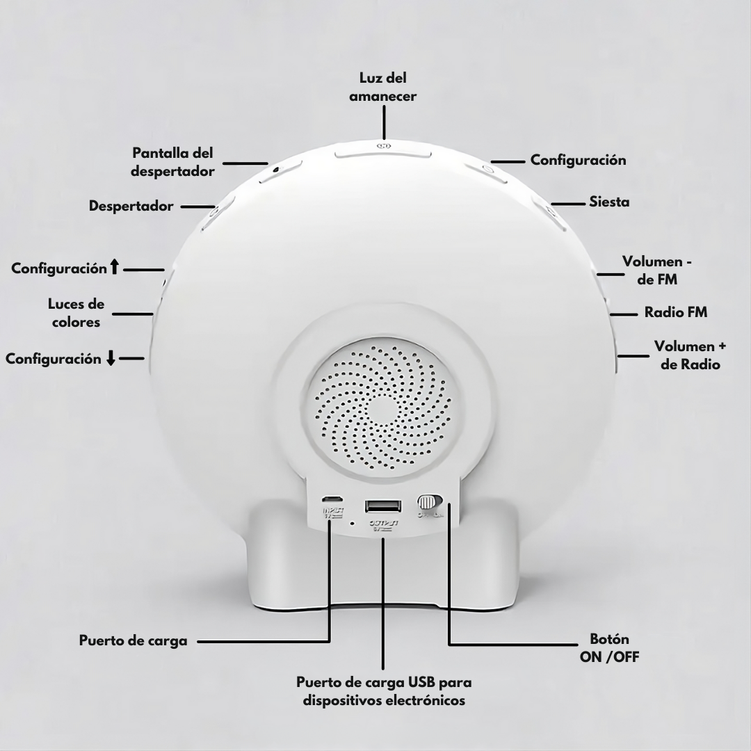 ✔ Luz cálida que aumenta gradualmente antes de sonar la alarma